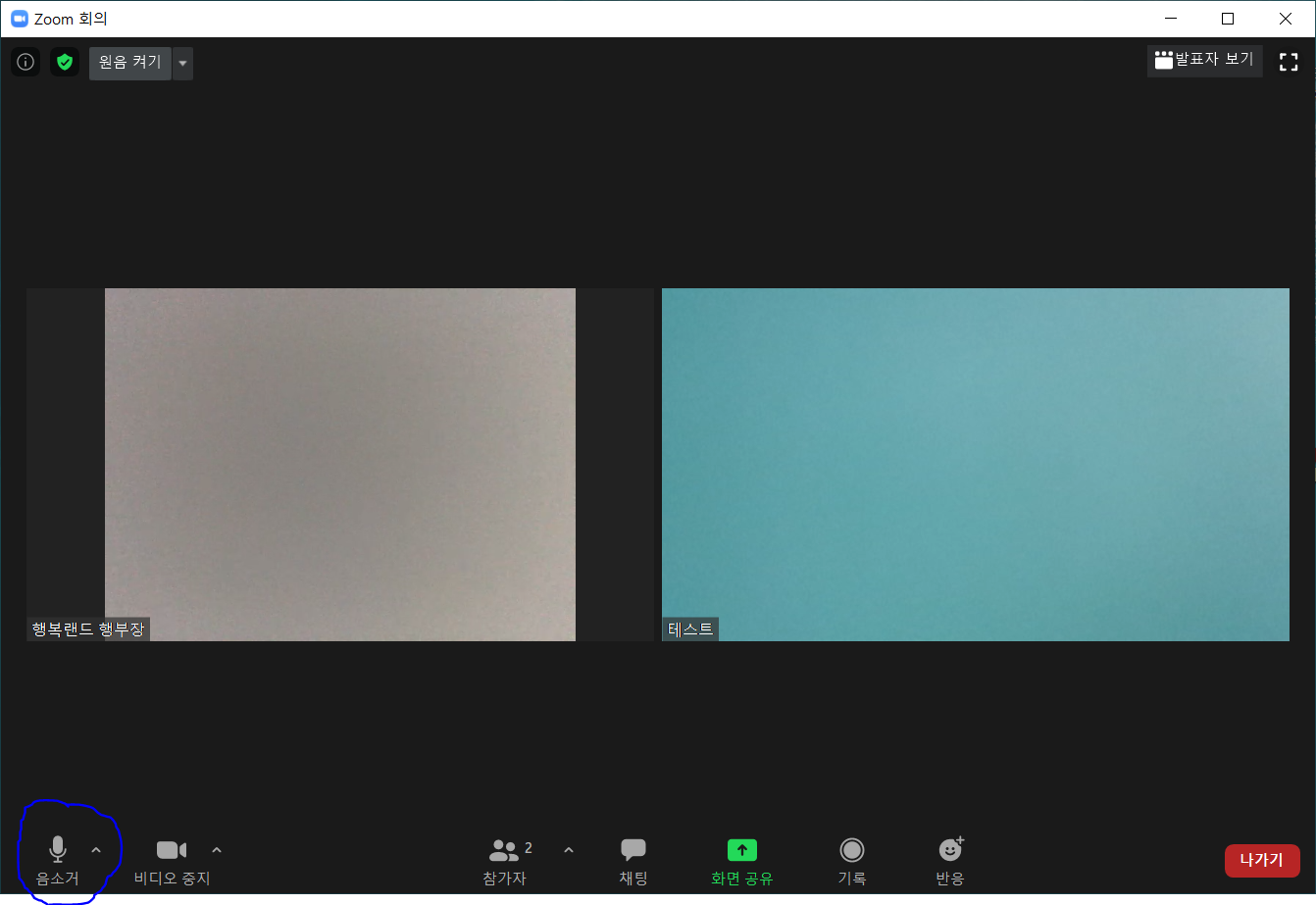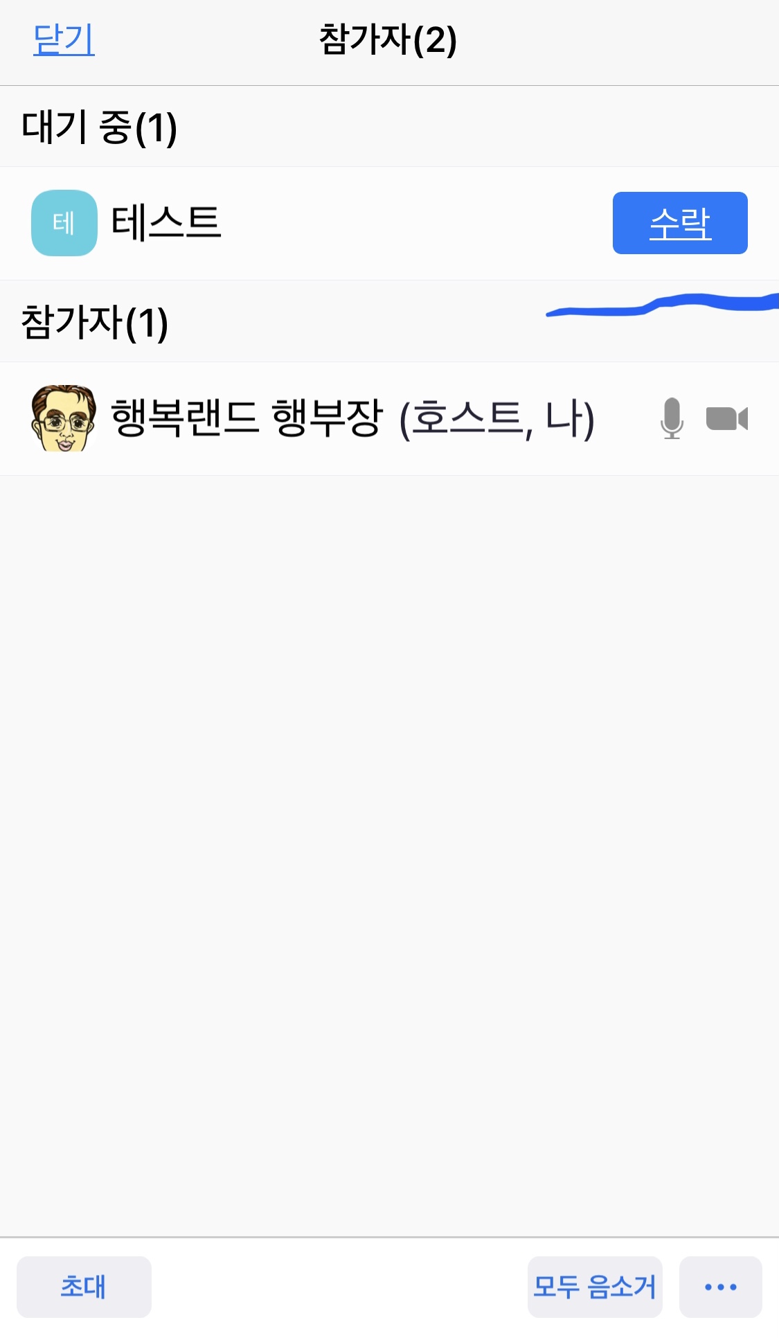 호스트가 대기 중인 PC사용자(테스트)에게 회의실 입장을 수락해야 합니다.