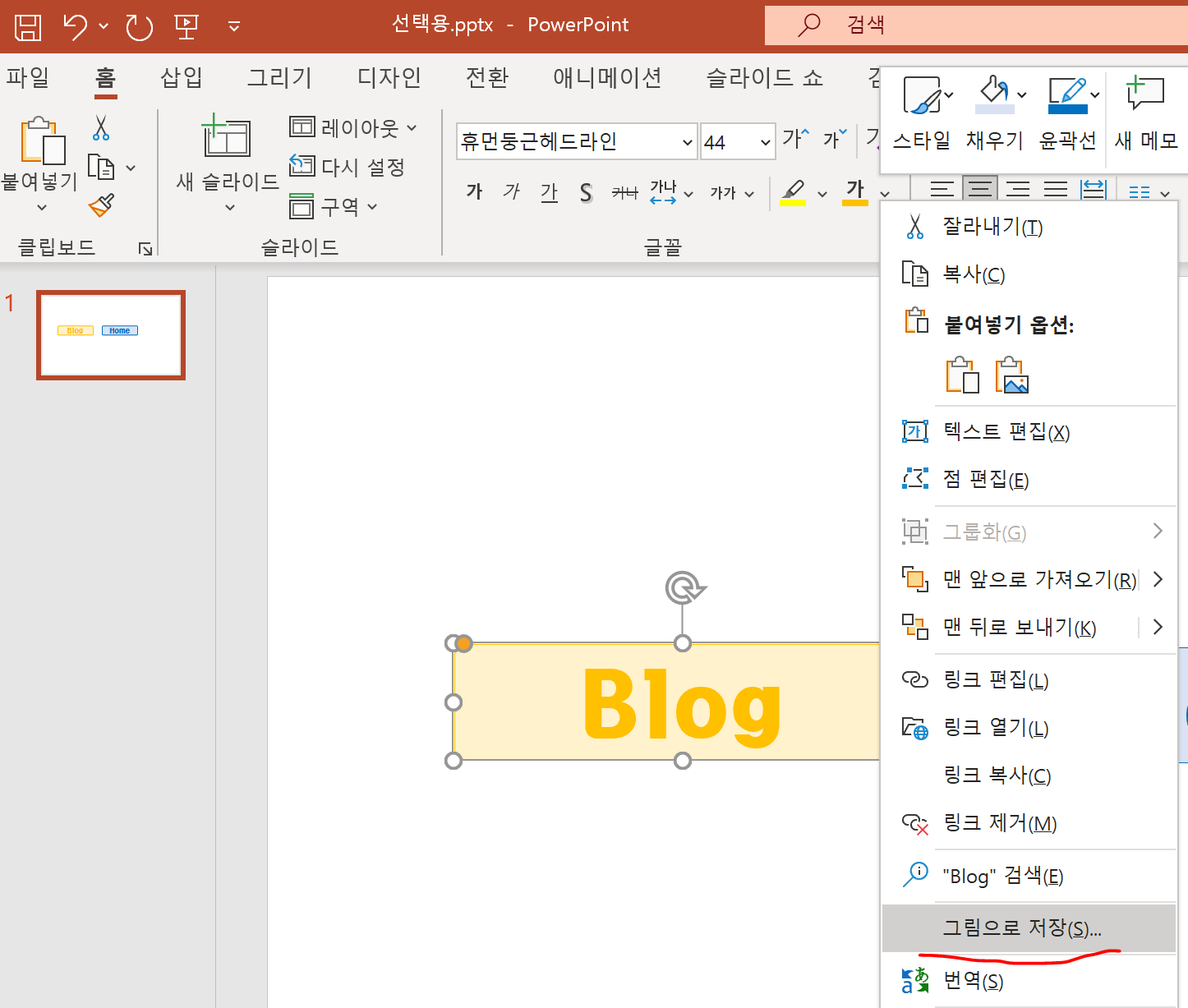 추가로 ppt에서 해당하는 버튼 이미지를 쉽게 만들 수 있습니다. 이후 전체 이미지를 선택하고 우클릭하여 "그림으로 저장"을 선택하여 저장합니다. (png 권장)